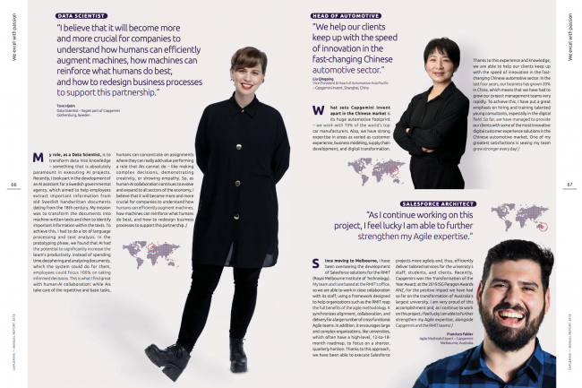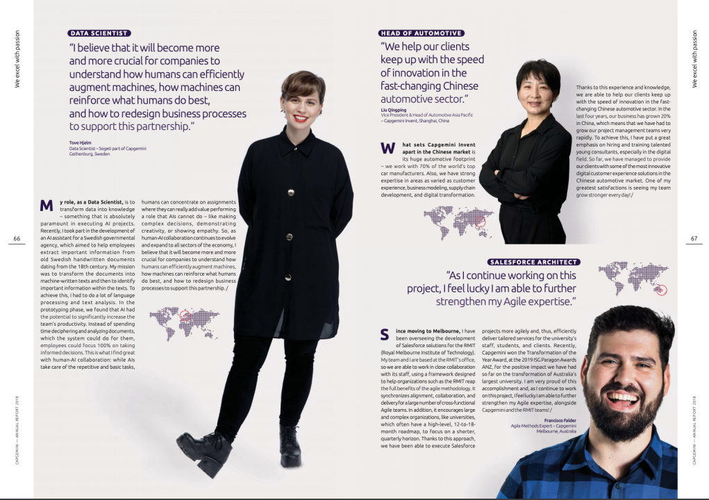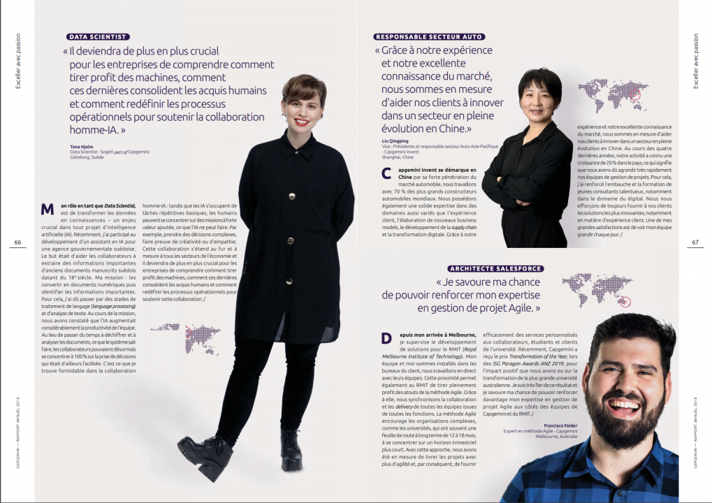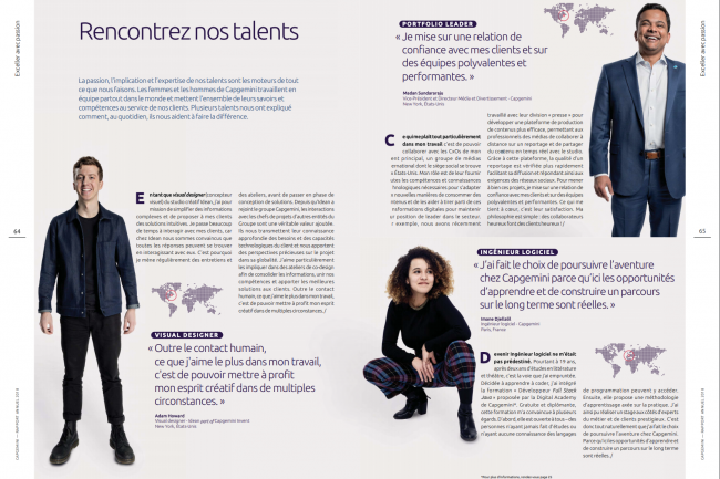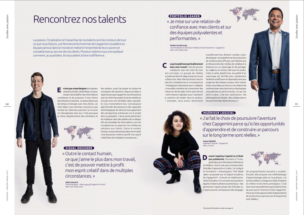 Comment mettre les talents Capgemini à l’honneur dans son rapport annuel ? Pour répondre à cette problématique, j’ai réalisé des portraits inspirants de collaboratrices et collaborateurs du monde entier qui incarnent la réussite du Groupe.